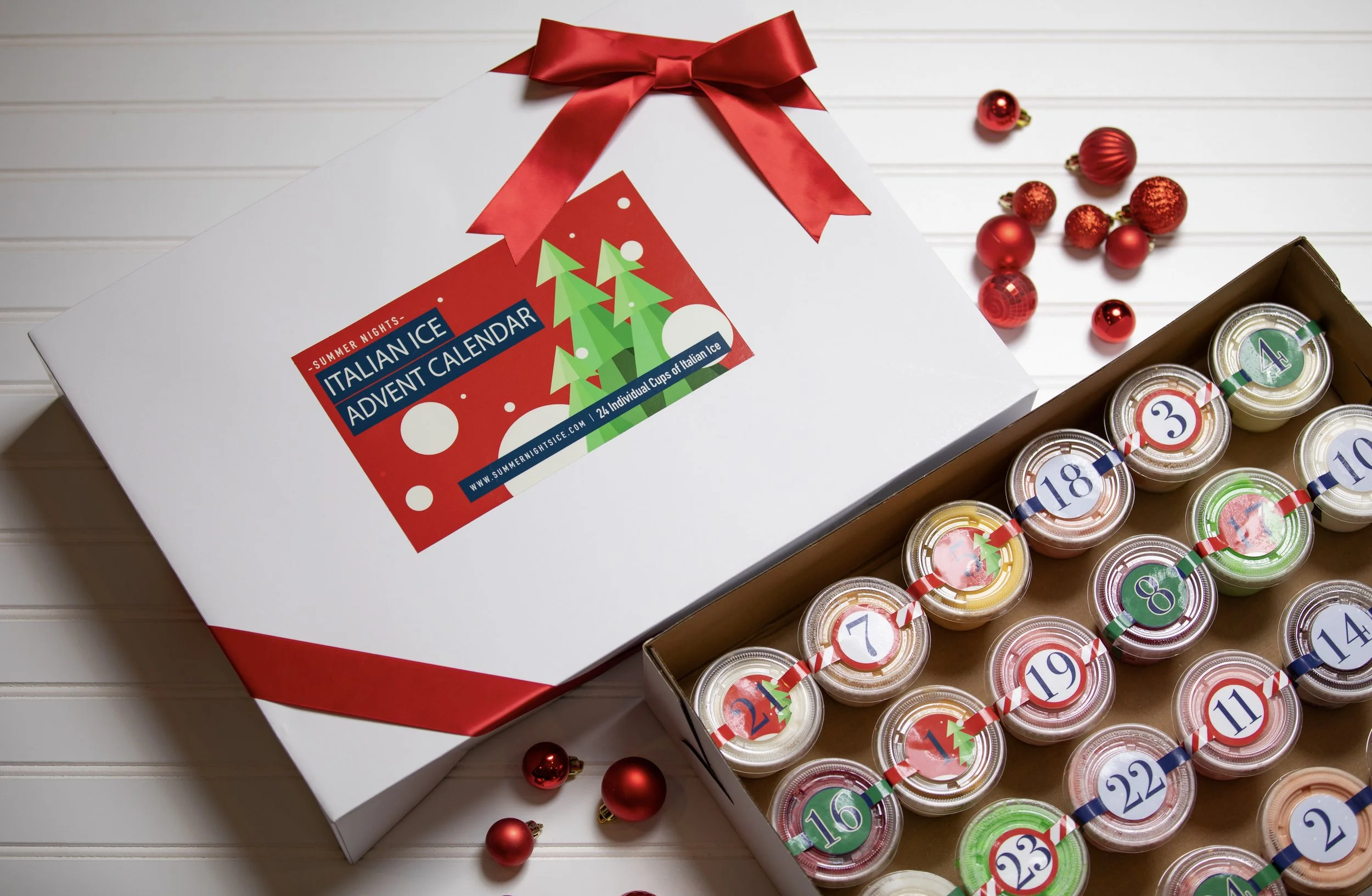 Each advent calendar features twenty four 5.5 ounce cups of your favorite Italian Ice flavors packaged in a gift box.